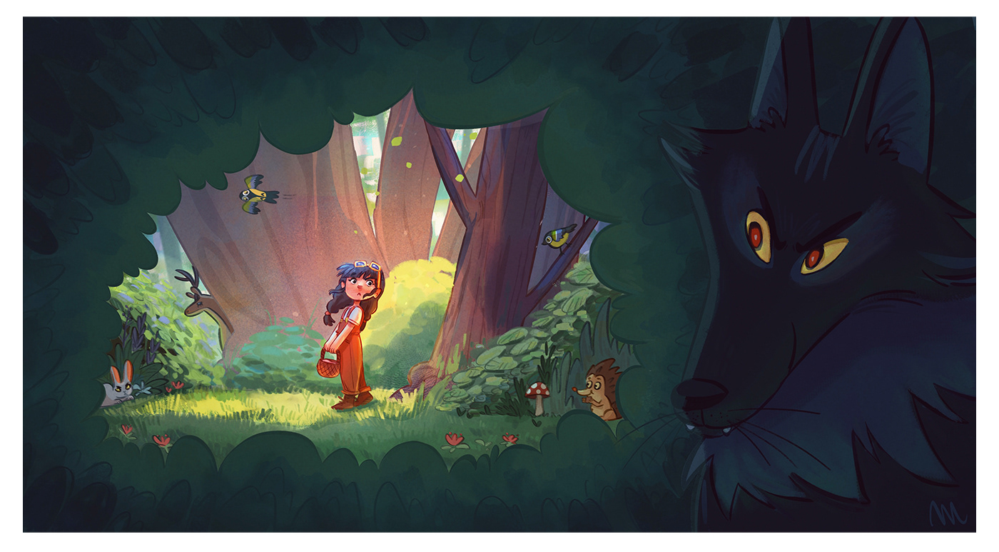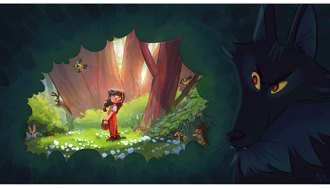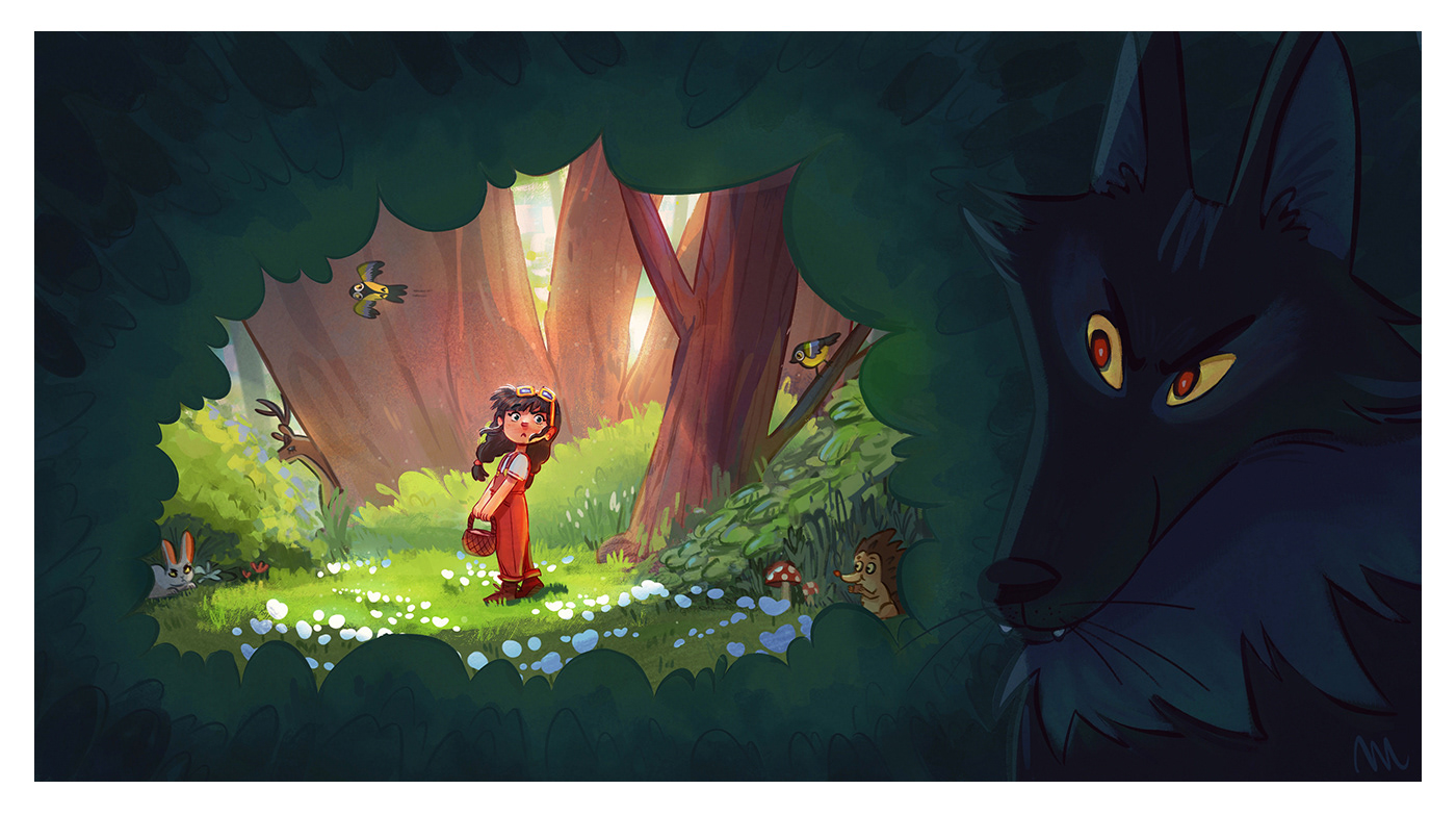 Deep in the heart of the forest, a young girl in red wanders among blooming flowers, chirping birds, and curious woodland creatures. But hidden behind the shadows, a pair of glowing eyes follows her every step… the wolf is waiting.