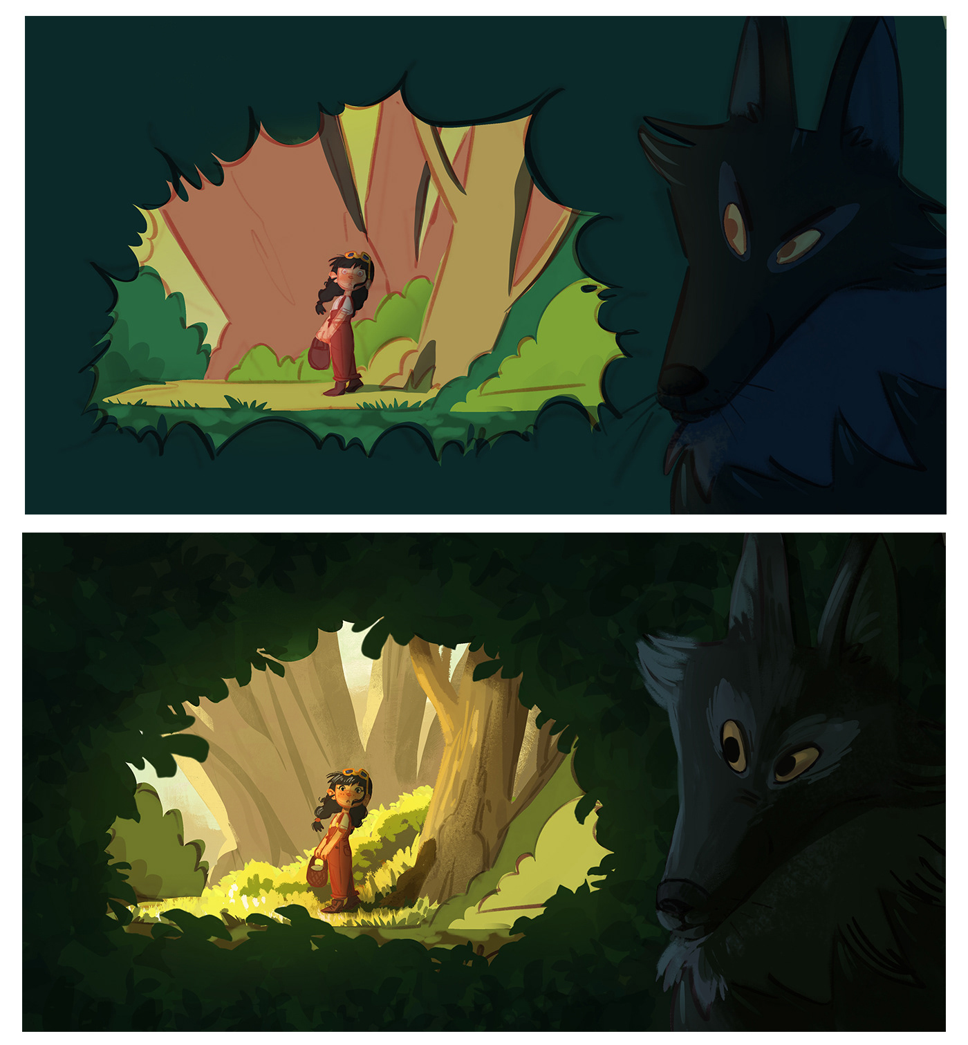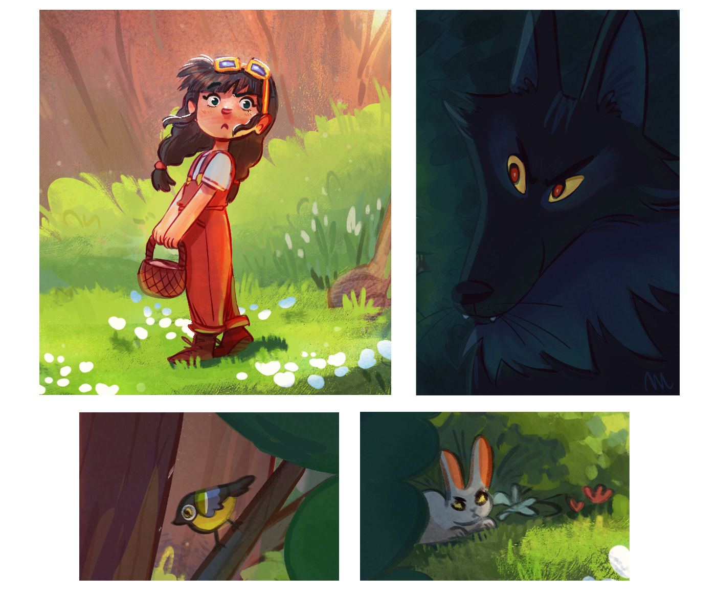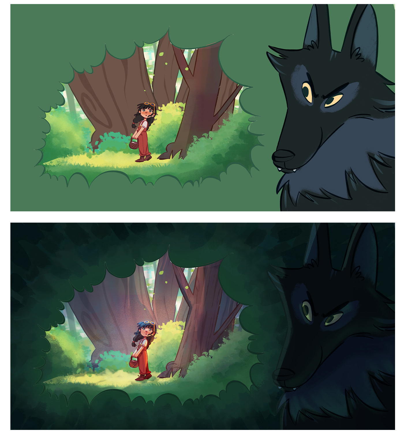 Deep in the heart of the forest, a young girl in red wanders among blooming flowers, chirping birds, and curious woodland creatures. But hidden behind the shadows, a pair of glowing eyes follows her every step… the wolf is waiting.
