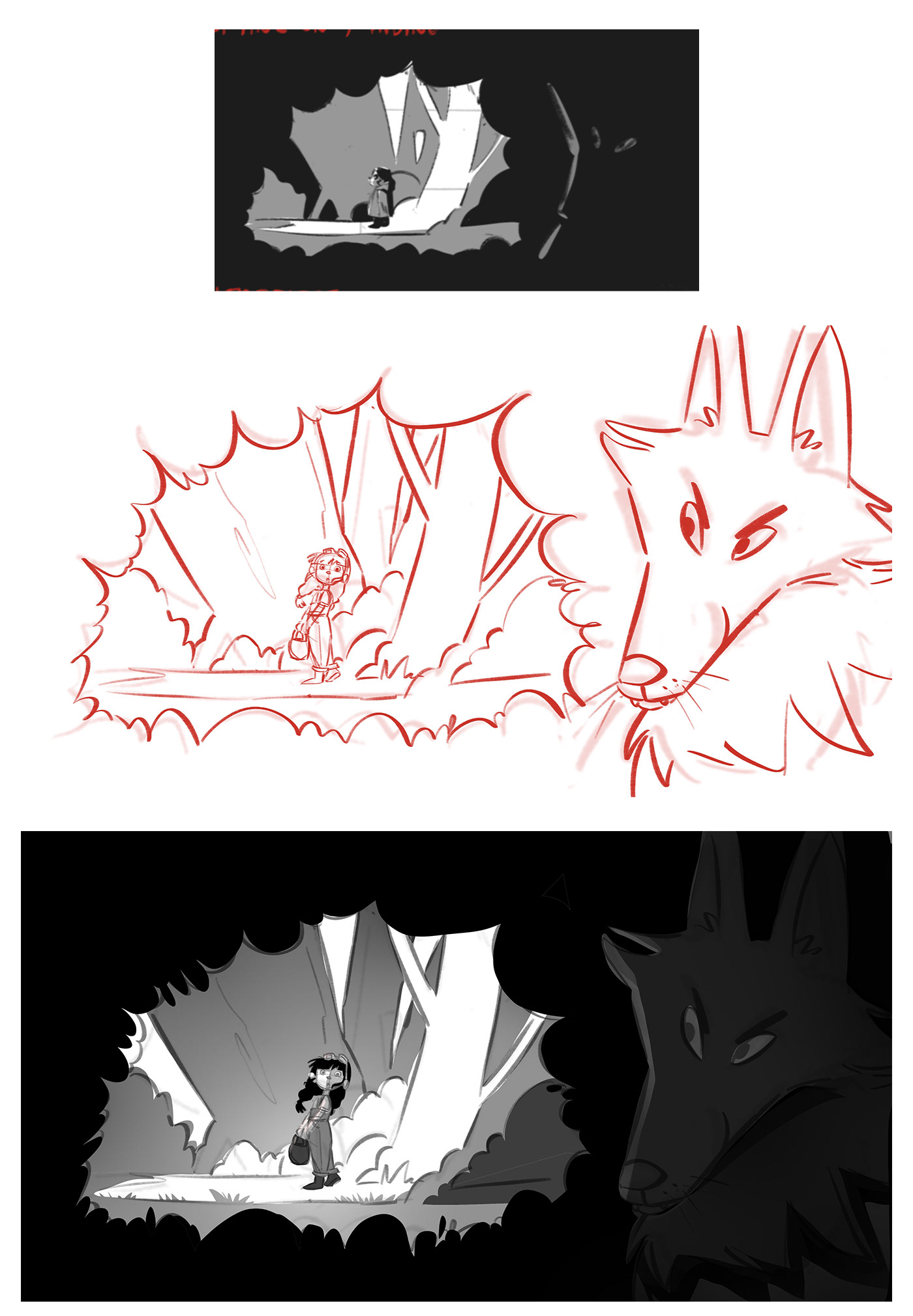 But it still lacked some detail and life in the forest, so added some birds and other animals and made the wolf a bit more menacing with the red eyes.